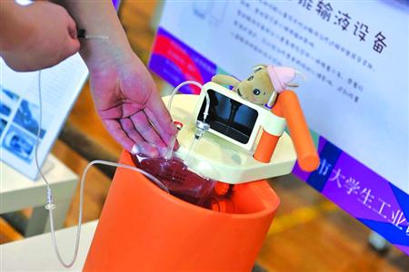 在昨天大賽現(xiàn)場,一款橙黃色的兒童智能輸液設(shè)備引來了很多觀眾的關(guān)注。這套兒童智能輸液設(shè)備被設(shè)計成一個小推車的形狀,該參賽項目的指導(dǎo)老師、上理工工業(yè)設(shè)計專業(yè)副教授施瀚介紹,這個項目的設(shè)計者去醫(yī)院調(diào)研時,發(fā)現(xiàn)患兒長時間輸液會產(chǎn)生緊張、孤獨、害怕等不良情緒,因此發(fā)明了這個可移動的小推車?;純涸谳斠簳r可以坐在小推車上,并且可以像在家中一樣,推著小車、帶著玩具四處走動,給治療帶來積極的心理影響。